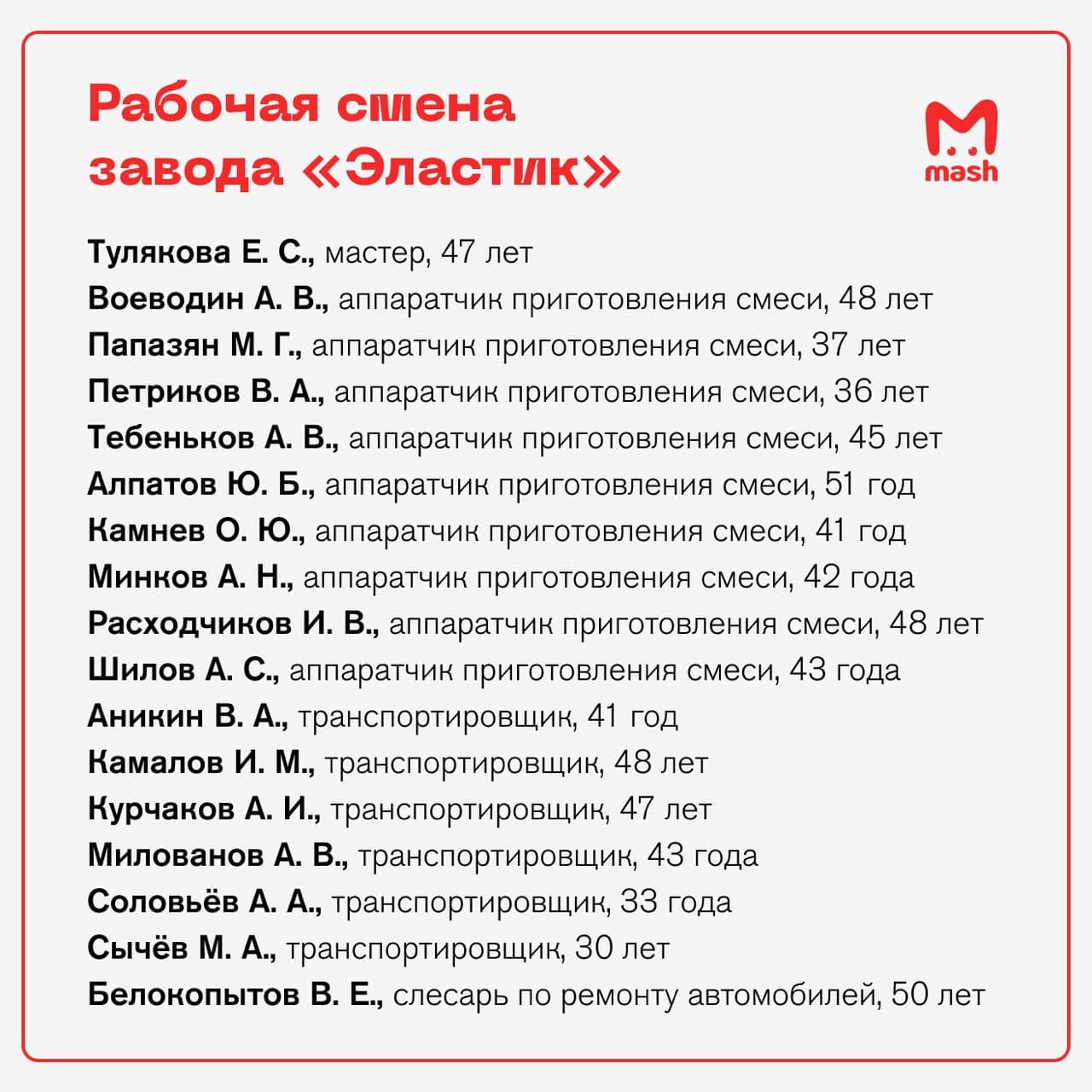 Кількість жертв збільшилася - повідомляється про 16 загиблих. Крім того, Telegram-канал Mash опублікував список зміни робітників заводу "Еластик", на якому стався вибух.