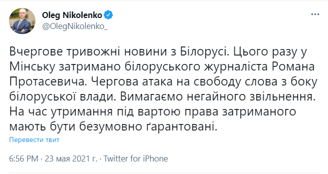 "Вчергове тривожні новини з Білорусі. Цього разу у Мінську затримано білоруського журналіста Романа Протасевича. Чергова атака на свободу слова з боку білоруської влади. Вимагаємо негайного звільнення. На час утримання під вартою права затриманого мають бути безумовно ґарантовані", - написав Ніколенко.