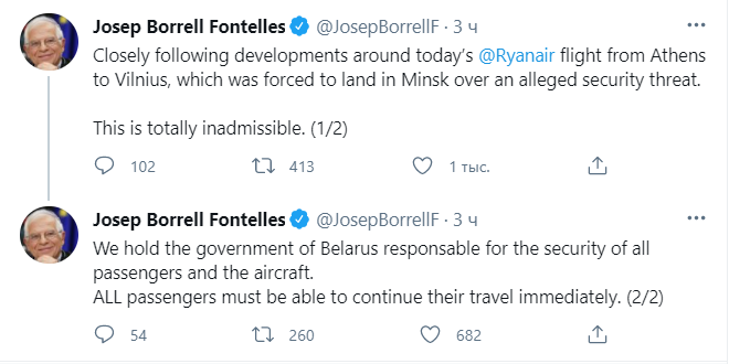 "Це (вимушена посадка літака) абсолютно неприйнятно. Ми вважаємо владу Білорусі відповідальною за безпеку усіх пасажирів та літака. УСІ пасажирі повинні мати можливість негайно продовжити подорож", - написав він.
