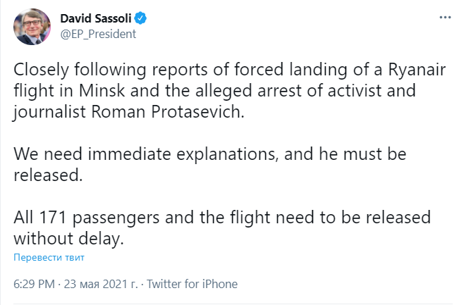 Глава Європарламенту Давид Сассолі зажадав негайних пояснень від Мінська в зв'язку з затриманням Романа Протасевича.