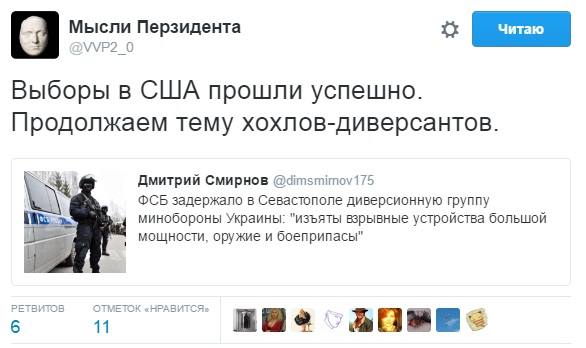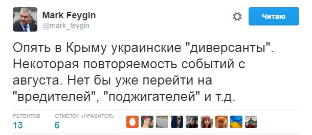 "Знову в Криму українські "диверсанти". Певна повторюваність подій з серпня. От би вже перейти на "шкідників", "паліїв" тощо", - написав він.