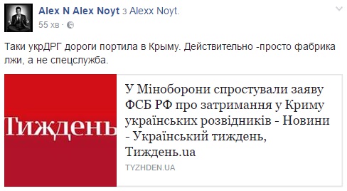 Як повідомляв "Апостроф", спікер Міністерства оборони України з питань АТО Андрій Лисенко спростував затримання в окупованому Севастополі українських диверсантів. Він підкреслив, що після аналізу попередніх заяв можна зробити висновок, що ФСБ "перетворилася на фабрику брехні".