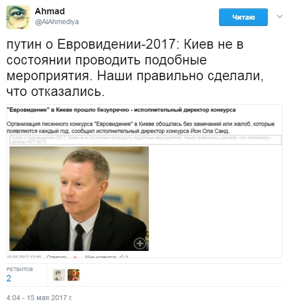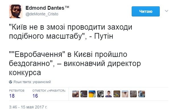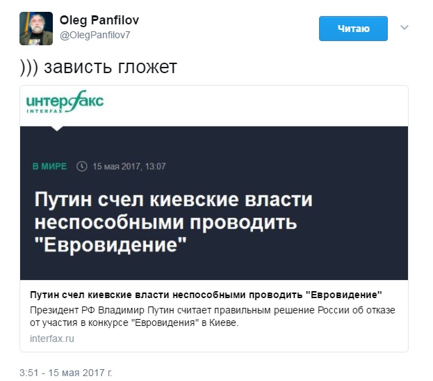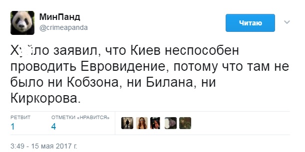 "Те, що наші структури, залучені в процес, відмовилися брати участь у (Євробаченні, - ред.), думаю, що вчинили правильно, тому що, на мій погляд, сьогоднішні київська влада не в змозі проводити захід подібного роду", - зазначив глава РФ, додавши, що ті, хто хотів подивитися Євробачення-2017, могли це зробити в інтернеті.