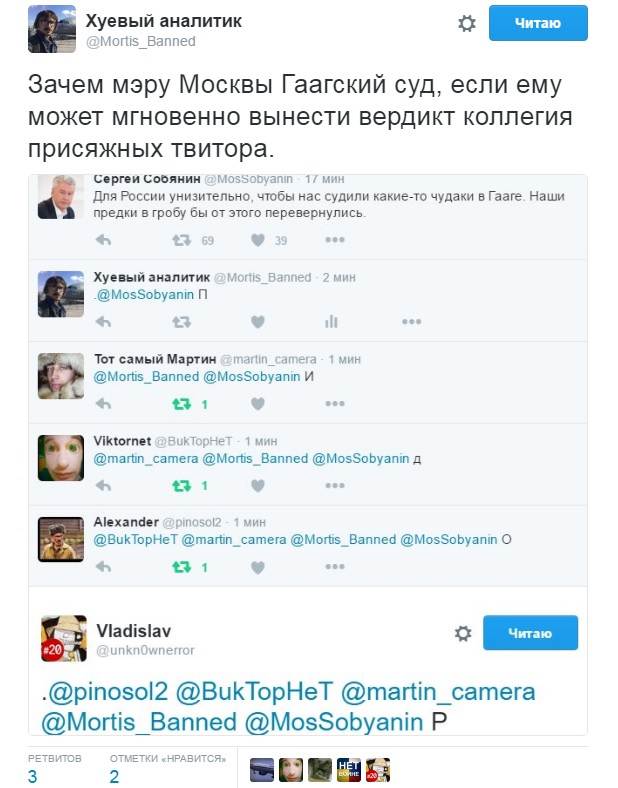 "Для Росії принизливо, щоб нас судили якісь диваки в Гаазі. Наші предки в труні б від цього перекинулися", - написав Собянін.