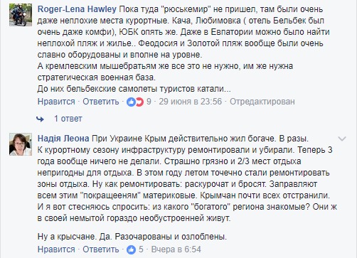 "Була в Криму. Плювалася так, що слів не досить буде, там такий капець, ще з совка не вилізуть ніколи", - передає слова росіянки блогер. Жінка додала, що мешканці півострова після анексії сильно зубожіли і звинувачують у цьому Росію. "І ось ви росіяни-вивертайте свої кишені, ви нам повинні", - розповіла вона.