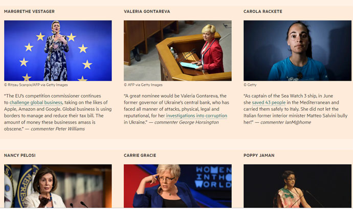 Крім Валерії Гонтаревої в списку найвпливовіших жінок 2019 року виявилися шведська еко-активістка Грета Тунберг, американська сенатор Елізабет Уоррен, спікер палати представників США Ненсі Пелосі, режисер і сценарист Фібі Уоллер-Брідж і прем'єр-міністр Норвегії Ерна Сульберг.