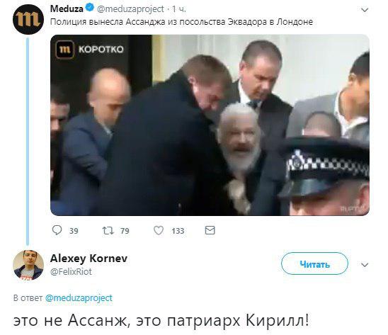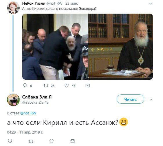 "Ассанж або патріарх Кирило?", "Що Кирило робив у посольстві Еквадору?", "А що, якщо Кирило і є Ассандж?", "Англійці викрали Кирила прямо з опочивальні", - коментують із сарказмом користувачі.