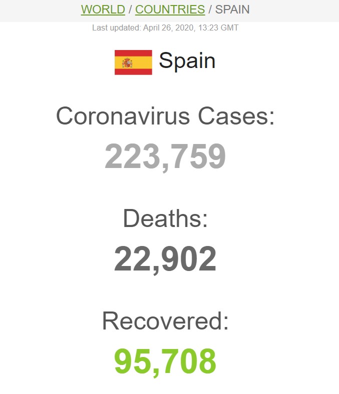 З середини березня в Іспанії діє режим підвищеної готовності. Якщо зниження числа випадків зараження продовжиться, уряд обіцяє приступити до пом'якшення обмежувальних заходів з 2 травня - дозволити громадянам гуляти і займатися спортом на вулиці.