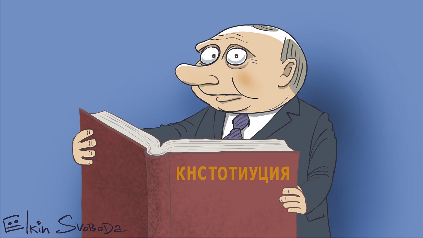 На малюнку російський президент Володимир Путін з виразом нерозуміння на лицы тримає в руках величезну книгу, яка названа "Кнстотіуція".