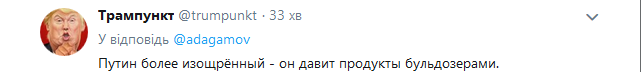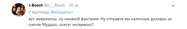 "Путін більше витончений - він чавить продукти бульдозерами", "Ось американці, ну ніякої фантазії. Ну відправте їм готівкові долари з рахунків Мудуро. Спалять цікаво?", "То п*дц, готовий у себе канібалізм розвести, аби на троні сидіти", - пишуть коментатори.