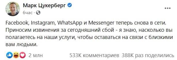 Перша реакція Марка Цукерберга була через кілька годин після початку збою. Він вибачився і обіцяв, що все скоро запрацює в штатному режимі.