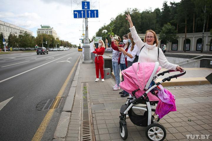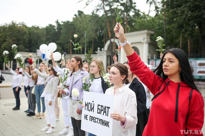Також в Мінську біля парку Челюскінців люди вишикувалися в невеликий живий ланцюг, в руках вони тримають квіти. Таким чином вони висловлюють солідарність з незаконно затриманими учасниками протесту і виступають проти жорстоких дій правоохоронців.