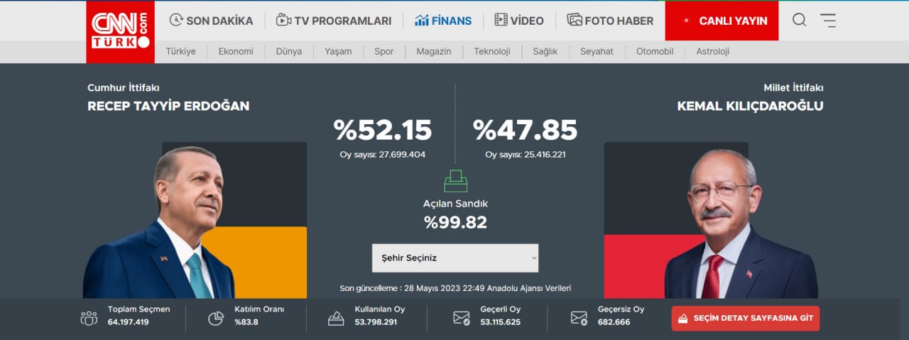 Станом на 22:59, він отримав 52,1% голосів, а Кемаль Киличдароглу – 47,9%.
