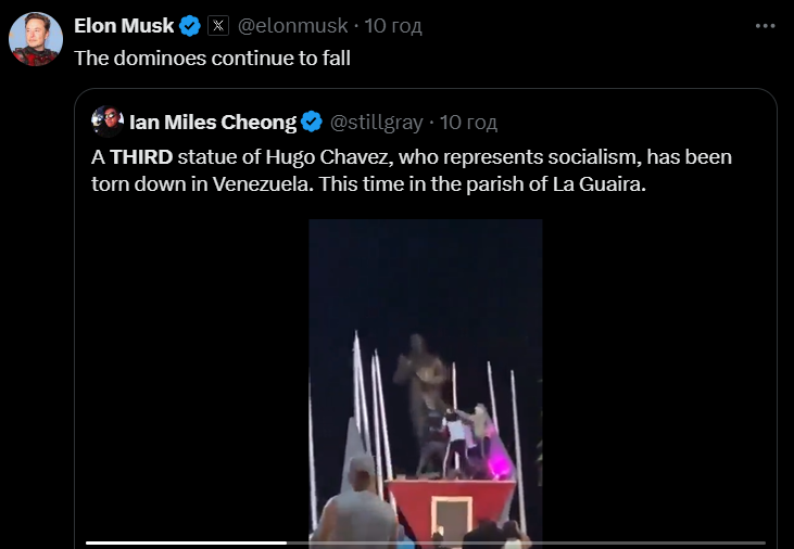 Маск вказував, що "yарод Венесуели хоче змін!", а також поширював відео того, як місцеві під час протестів скидали постаменти, коментує це так: "Доміно продовжує падати".