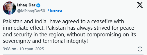 "Пакистан завжди прагнув миру та безпеки в регіоні, не поступаючись своїм суверенітетом та територіальною цілісністю!", - написав міністр закордонних справ Пакистану Ісхак Дар.