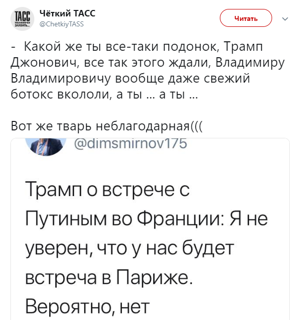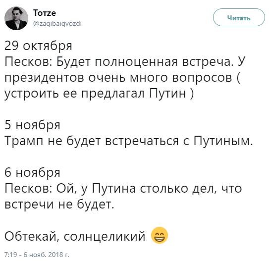 "29 жовтня Пєсков: Буде повноцінна зустріч. У президентів дуже багато питань (влаштувати її пропонував Путін). 5 листопада: Трамп не зустрічатиметься з Путіним. 6 листопада Пєсков: Ой, у Путіна стільки справ, що зустрічі не буде. Обтікай, сонцеликий", "Який же ти все-таки покидьок, Трамп Джонович, усі так цього чекали, Володимиру Володимировичу взагалі навіть свіжий ботокс вкололи, а ти... а ти...", - не без сарказму пишуть користувачі.