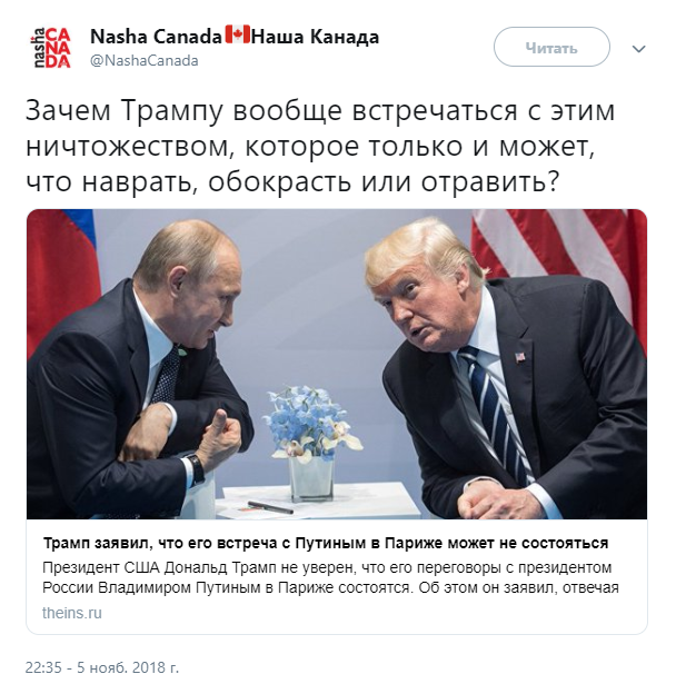 5 листопада Трамп заявив, що ця зустріч може не відбудуться, але він розраховує поговорити з Путіним під час саміту G20 в Аргентині, який відбудеться 30 листопада - 1 грудня.
