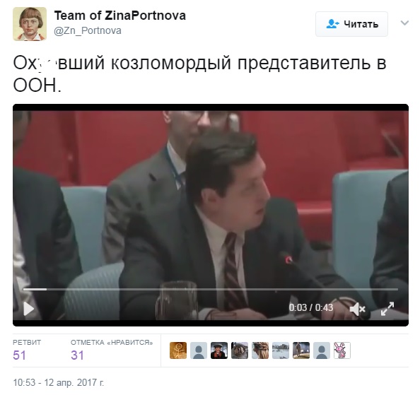 "Пане голово, прохання слідкувати за порядком розвитку засідання, якщо деякі безвідповідально, образливо, збиваючись на сленг, ставляться до свого місця в Раді Безпеки ООН. Не смій ображати Росію більше", - сказав заступник постпреда РФ в ООН.