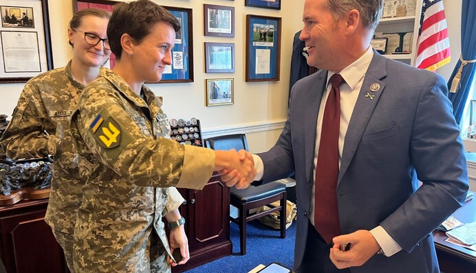 "У вересні 2022 ми мали теплу зустріч з Конгресменом Волтцом. Дівчата-військові Дар'я Зубенко та Іванна Чобанюк подарували Майклу монету, викувану з підбитого російського танку з харківського успішного контрнаступу. В ті дні ми адвокатували передачу Україні броньованих автомобілів Bradley та танків Abrams... А щодо світогляду Волтца можете судити з картини, яка висіла у нього на вході в кабінеті", - написала журналістка, опублікувавши фото.