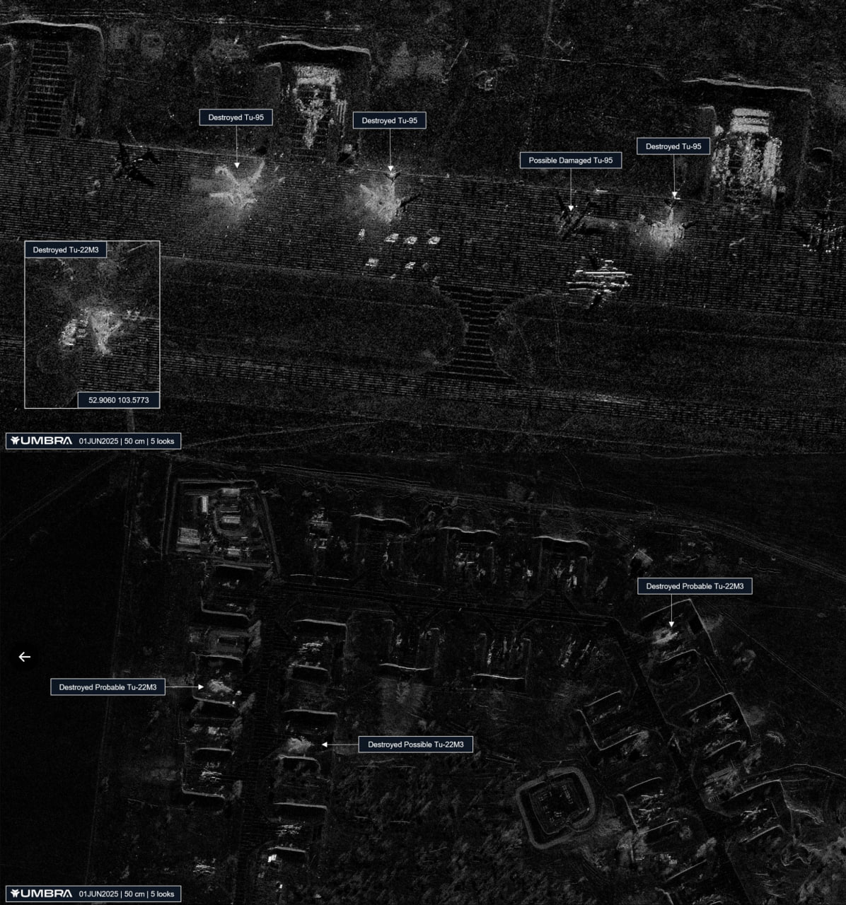У мережу виклали перший супутниковий знімок, зроблений після атаки СБУ по військових авіабазах Росії 1 червня. Фото ілюструє пошкодження на авіабазі "Бєлая", підтверджуючи ураження літаків Ту-95МС та Ту-22М3.