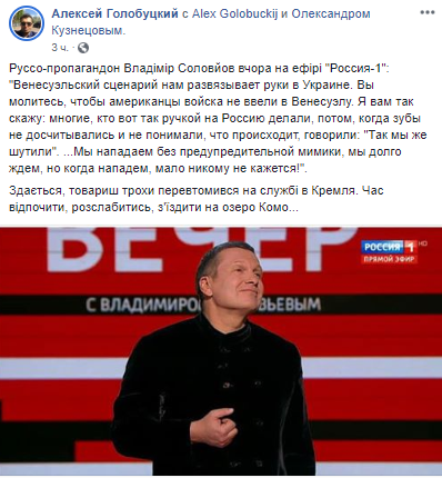 "Руссо-пропагандон Владімір Соловйов вчора на ефірі" Росія-1": "Венесуельський сценарій нам розв'язує руки в Україні. Ви моліться, щоб американці війська не ввели до Венесуели. Я вам так скажу: багато, хто ось так ручкою на Росію робили, потім, коли зубів не дораховувалися і не розуміли, що відбувається, говорили: "Так ми ж жартували"... Ми нападаємо без попереджувальної міміки, ми довго чекаємо, але коли нападемо, мало нікому не здається!", - процитував він, додавши, що пропагандист, мабуть "втомився".