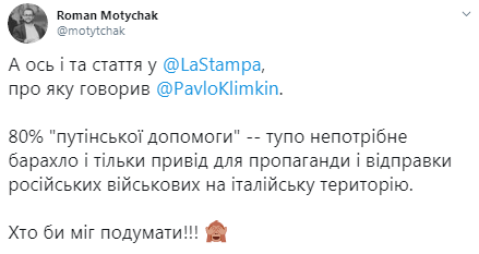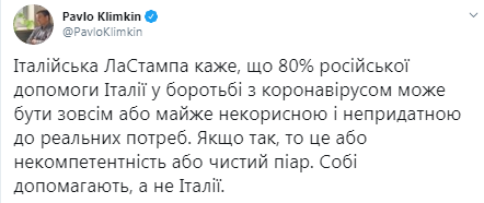 "Італійська ЛаСтампа (місцеве видання La Stampa - "Апостроф") говорить, що 80% російської допомоги Італії в боротьбі з коронавірусом може бути зовсім або майже марною і непридатною до реальних потреб. Якщо так, то це або некомпетентність або чистий піар. Собі допомагають, а не Італії", - написав він.