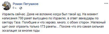 "Трагічність проміжні підсумки. Понад 700 ракет за 36 годин було випущено бойовиками по Ізраїлю. Троє ізраїльтян загинуло, 130 постраждало. З палестинської сторони загинула 21 особа, 90 осіб поранено, велика частина загиблих бойовики ХАМАСу або "Ісламського джихаду". Є також інформація про загибель людей в Газі після падіння ракети ХАМАСу", - йдеться у повідомленні.