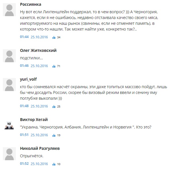 "Мабуть, з цього списку тільки Норвегію можна назвати країною. Решта – фуфло", "Підстилки", "А Екваторіальна Гвінея чому не в списку??", "Авангард плазунів-шакалів", "Ввести відповідні санкції проти не дружніх країн! Хохлам перекрити газ! Норвегії не продавати рибу і не брати їх тухляк! Чорногорію теж принизити і розтоптати публічно на рівні МЗС! З албанією і лихтиншейтном і так все ясно! Вистачить утиратися пора їх іпашить у відповідь!!!!", - пишуть коментатори.