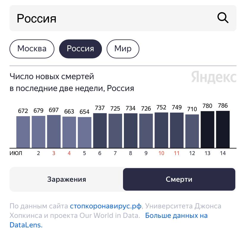 Росія побила антирекорд по смертям від коронавірусу, який тільки вчора встановила. За 14 липня померли 786 осіб.
