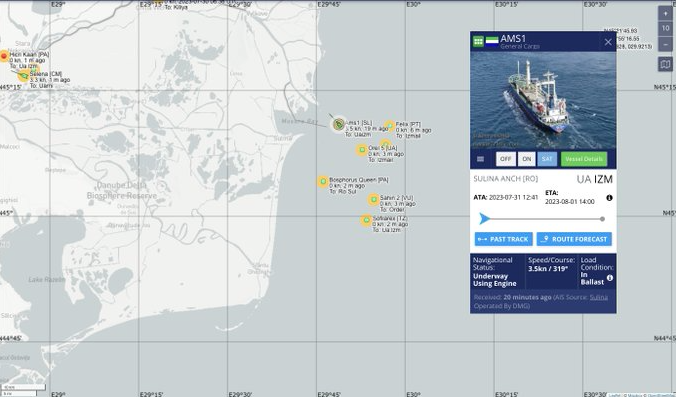 Вже сьогодні Ams1 увійшов до української галузі Дунаю. Це перший корабель, який прорвав російську блокаду Чорного моря після бомбардування Рені 25 липня. Починаючи свою подорож з Ашдода, він відкрито оголосив пункт призначення – Україна і перетнув Чорне море прямим курсом.