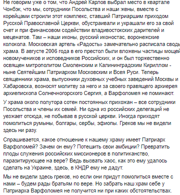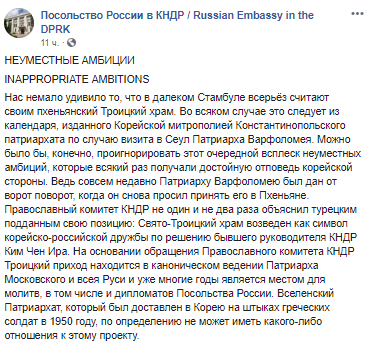 "Свято-Троїцький храм зведено як символ корейсько-російської дружби за рішенням колишнього керівника КНДР Кім Чен Іра. На підставі звернення Православного комітету КНДР Троїцький прихід знаходиться в канонічному веденні Патріарха Московського і всієї Русі", - йдеться в повідомленні.