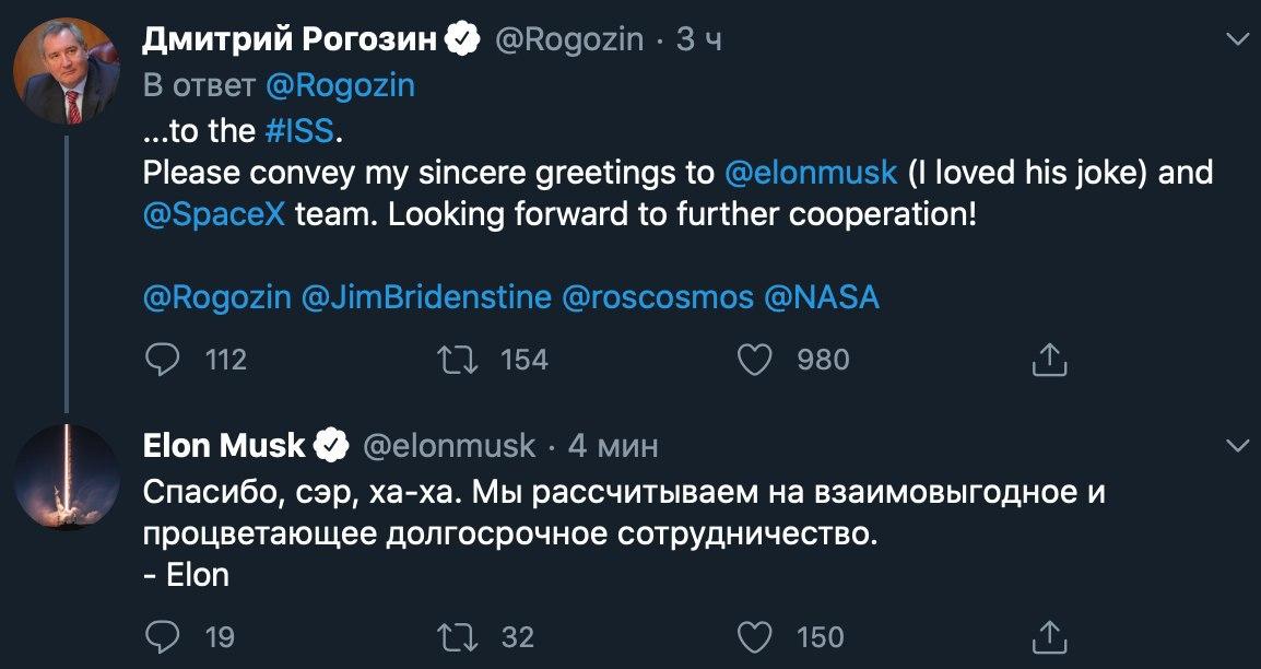 Рогозін своєю чергою привітав главу NASA з успішною стикуванням Crew Dragon c МКС і Ілона Маска і зазначив, що йому сподобалася його відповідь на жарт.