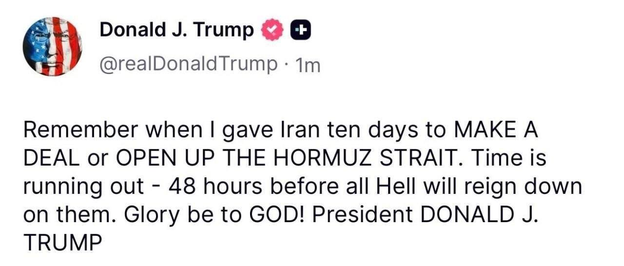 "Пам’ятаєте, як я дав Ірану десять днів, щоб УКЛАСТИ УГОДУ або ВІДКРИТИ ОРМУЗЬКУ ПРОТОКУ. Час спливає — 48 годин, перш ніж на них обрушиться пекло. Слава БОГУ!" — йдеться у дописі Трампа.