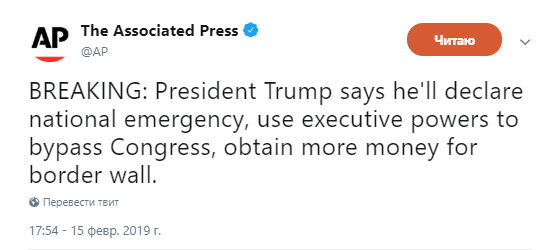 Президент США Дональд Трамп введе в США надзвичайний стан, щоб в обхід конгресу профінансувати будівництво стіни на кордоні з Мексикою.