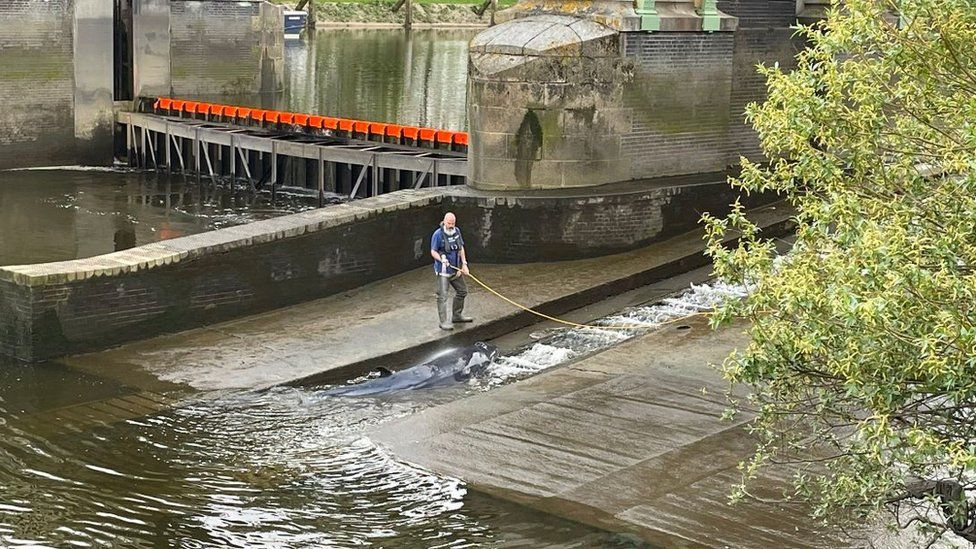 У Річмондському шлюзі дитинча кита розміром більше трьох метрів застрягло на мілині під час відливу в річці Темза.