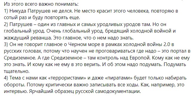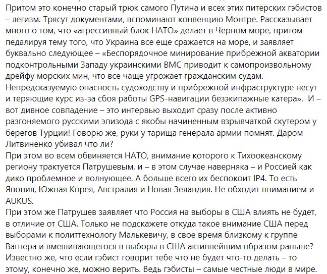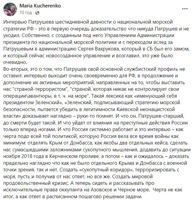Про це написала у Facebook старший аналітик Фонду "Повернись живим Марія Кучеренко, аналізуючи інтерв'ю Миколи Патрушева, який є помічником Путіна і займається питаннями національної морської політики.