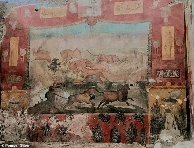 Основна частина фрески зображує лева, що переслідує бика, леопарда, який нападає на вівцю, і дикого кабана, що кидається на оленя. Вона була сильно пошкоджена виверженням Везувію, часом і вологою.