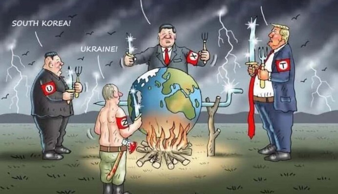 "Штош", - написав український блогер Сергій Наумович, що поділився тематичною ілюстрацією, на якій Трамп, Сі, Кім та путін намагаються поділити світ.