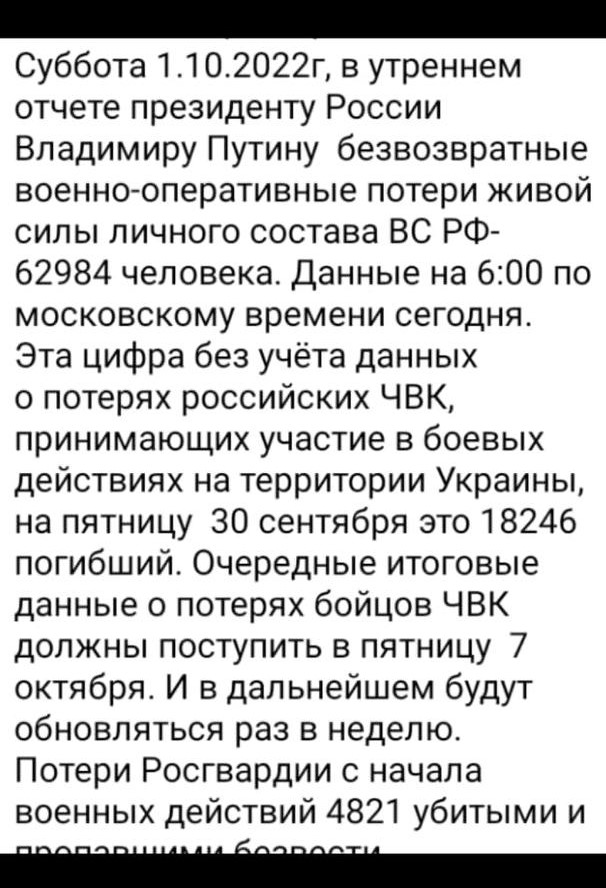 9:32 Загальні бойові втрати Росії на 1 жовтня орієнтовно склали: