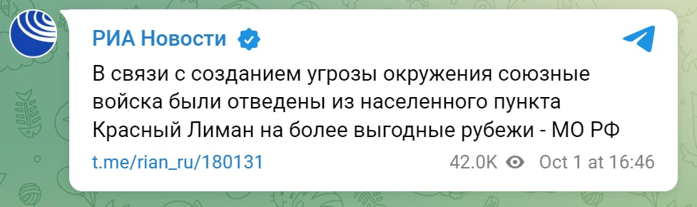 16:55 В Міноборони РФ підтвердили відступ з Лиману на "більш вигідні рубежі".