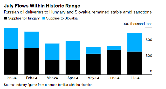 У матеріалі зазначається, що експорт російської нафти до Угорщини та Словаччини через територію України в липні, попри санкції проти "Лукойлу", залишався на нормальному рівні. Адже російська компанія "Татнефть" замістила більшу частину барелів, яких не вистачало.