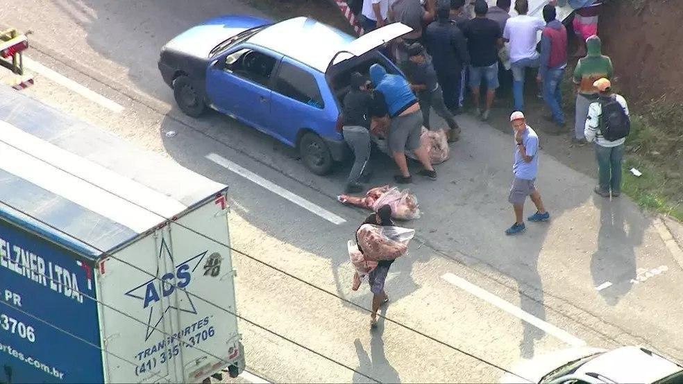 У Бразилії на дорозі Régis Bittencourt водій вантажівки, яка перевозила 25 тонн м'яса, не справився в керуванням і автомобіль перекинувся. На місце аварії відразу збігся натовп людей, які розікрали всю продукцію.
