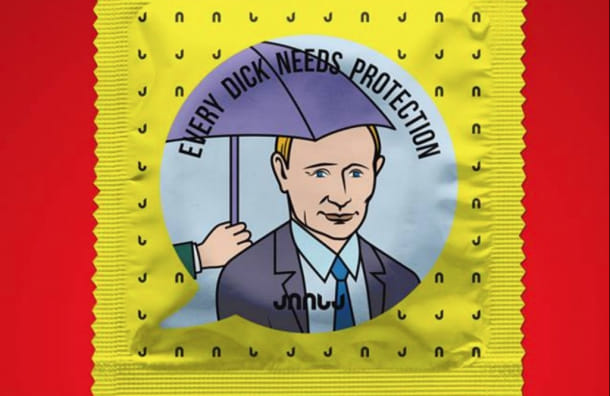 На упаковці презервативів із зображенням Путіна англійською мовою написано: "Кожен ч**н має бути захищений".