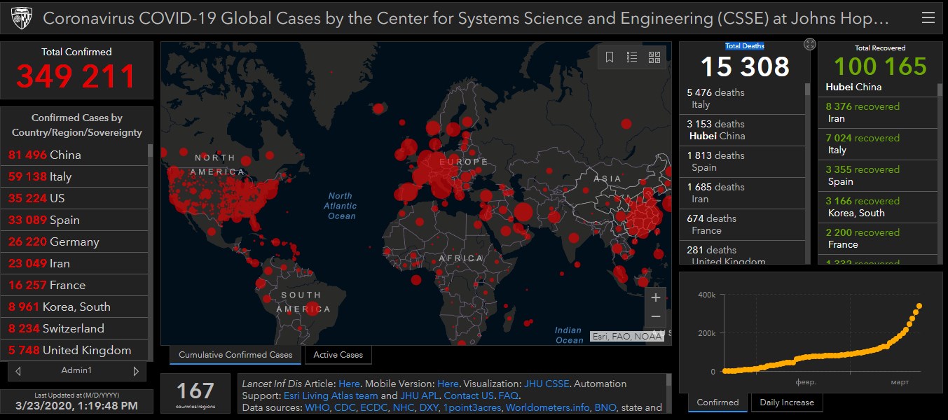 Про це можна судити з даних, наведених в онлайн-таблиці поширення COVID-19, опублікованій Центром системних наук та інженерії (CSSE) при американському Університеті Джона Хопкінса (JHU).