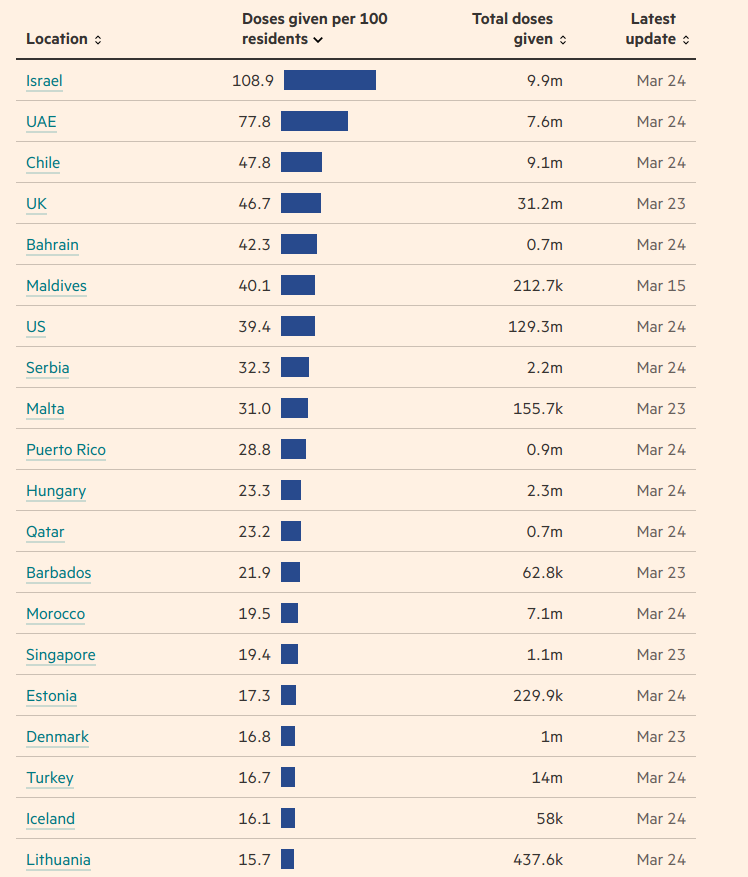 Експерти проаналізували стан проведення вакцинації від коронавірусу в світі і склали рейтинг країн, де досягнуто найвищих показників у проведенні щеплень від COVID-19. Очолює його Ізраїль, де вже більше половини населення отримало мінімум одну дозу вакцини.