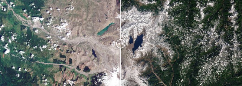 Також є фото відновлення гори Сент-Хеленс, Вашингтон. У 1980 році відбулося сильне виверження вулкана Сент-Хеленс, що знищило сотні квадратних метрів лісів. Чотири роки по тому, як видно на знімку 1984 года, потерпілий ландшафт як і раніше залишався безплідним. Але через чотири десятиліття в регіоні спостерігався значний підйом, як видно на знімку 2020 року. Великі білі області - це сніг.