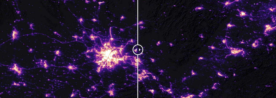 Два знімка з околиць китайського міста Ухань, зроблені в січні і лютому 2020 року, демонструють скорочення трафіку після введення карантину. Яскраві області на цих нічних знімках - це вогні Уханя і прилеглих населених пунктів. Світлові нитки, що з'єднують ці області на січневому знімку, шосе. Більшість автомагістралей зникли на лютневому знімку, зробленому після того, як влада Китаю призупинила поїздки в спробі стримати поширення коронавируса.
