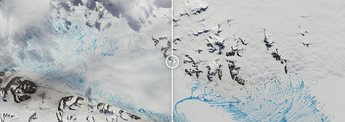 Зокрема показано танення льодовиків в Антарктиді. Сині області на зображенні 2020 року - це максимальне скупчення талої води - протяжністю 140 кілометрів - коли-небудь зареєстроване на шельфовому льодовику Георга VI. Ця масивна плита льодовикового льоду виступає із західного боку Антарктичного півострова і плаває у водах, що відокремлюють півострів від острова Олександра. Такі басейни можуть дестабілізувати шельфові льодовики, але Георг VI вважається досить міцним, щоб протистояти їм.