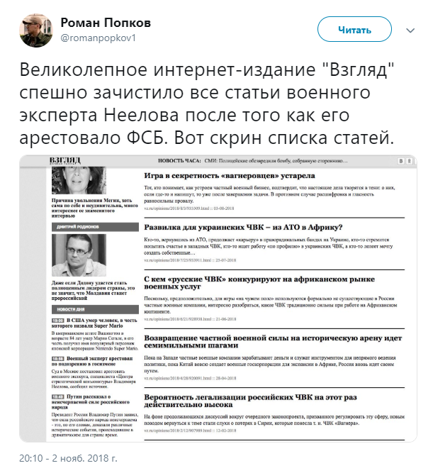 "Чудове інтернет-видання "Взгляд" спішно зачистило всі статті військового експерта Нейолова після того як його заарештувало ФСБ. Ось скрін списку статей", - написав активіст, прикріпивши скріншот матеріалів.