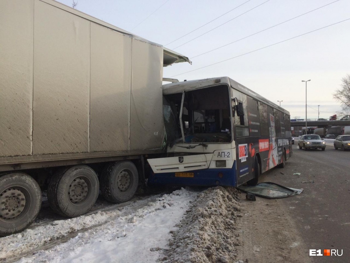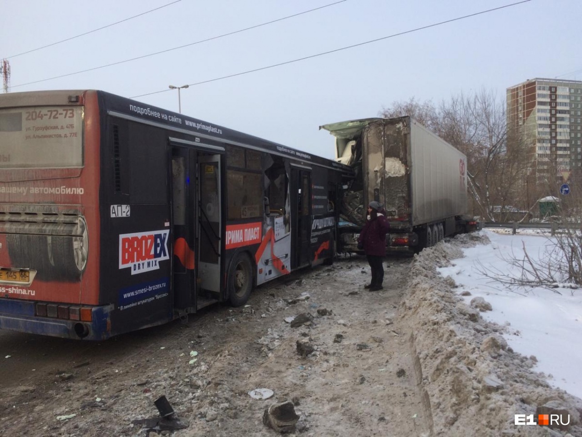 Попередньо встановлено, що водій автобуса НефАЗ маршруту №45 під час руху по дублерів Сибірського тракту з боку 40 років ВЛКСМ в сторону вулиці Малишева не забезпечив постійний контроль за рухом автобуса і допустив наїзд на що стояв на узбіччі вантажний автомобіль Volvo, - розповіли у відділенні пропаганди міської ГИБДД.